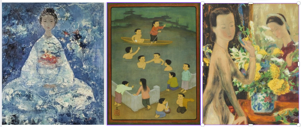 Il y a peut-être dans cet échec des années 60/70 une responsabilité des galeries[18] qui ont poussé cette production commerciale pour décorer les salles à manger des Viet Kieu de Californie. Il est aussi évident que ces trois artistes ont dû répondre aux commandes afin de subvenir aux besoins de leurs familles dans un contexte difficile. Les réserves que l’on peut émettre sur une partie de leur travail avec les galeries n’enlèvent donc rien à l’estime que l’on porte sur le parcours personnel de ces hommes[19] ainsi que sur la sincérité de leurs débuts.