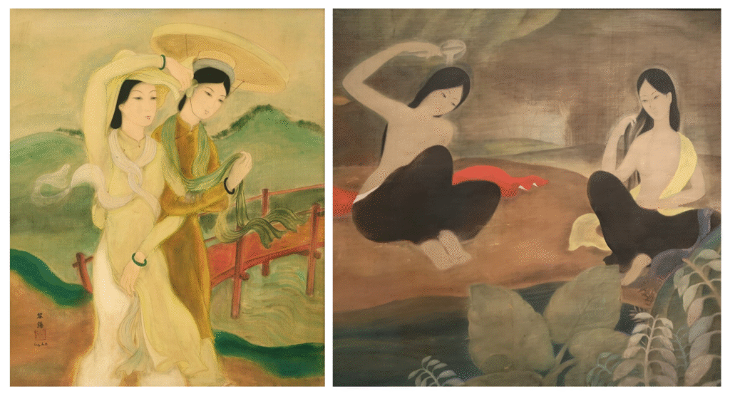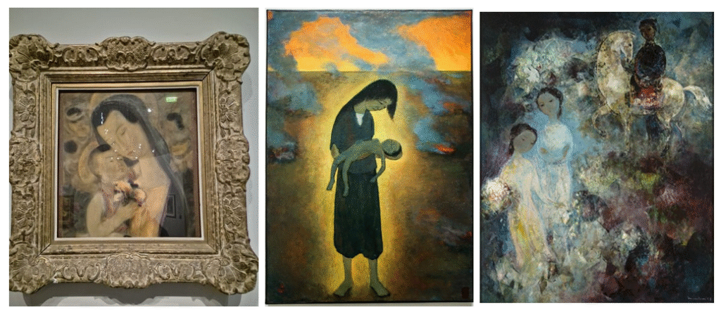 On n’en peut plus également des maternités de Vu Cao Dam et des chevaux, des coqs, des divinités, des thèmes du Kim-Van-Kieu des années 60 et 70. Quant aux petites scénettes de Mai Thu produites en série sur la même période et qui, pour beaucoup, ont fini en illustration de cartes postales pour l’UNESCO ou en centaine de « reproductions sur soie »[15], on a encore plus du mal à être indulgent. Et quand ce même Mai Thu s’essaie à une réinterprétation des œuvres classiques sauce vietnamienne (La Joconde, Gabrielle d’Estrée et sa sœur au bain, Olympia …), on sombre dans la kitscherie.