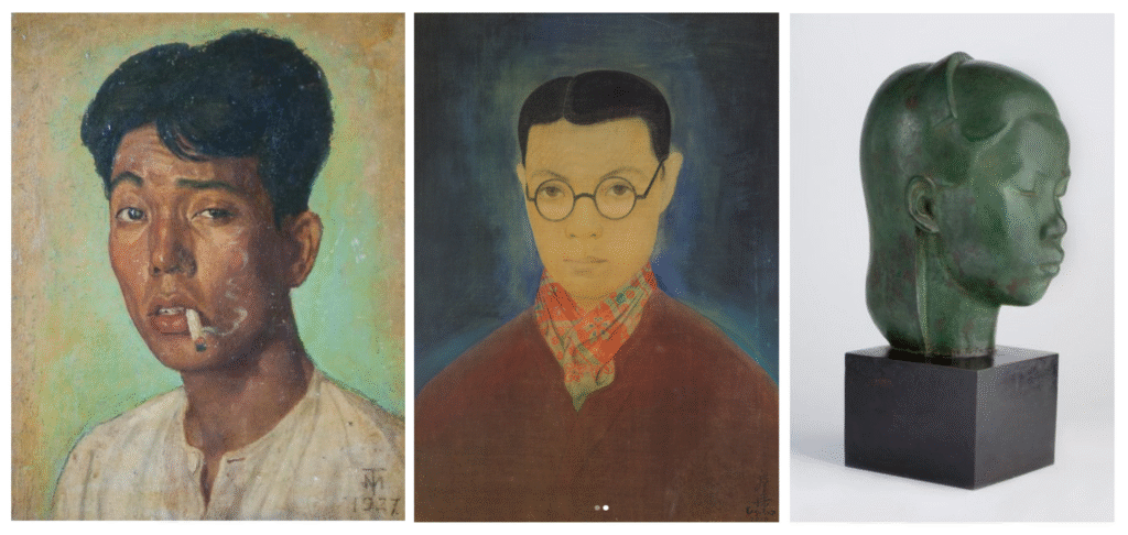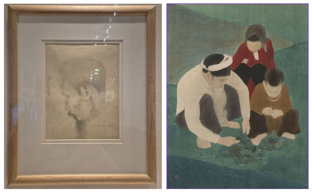 Notons ainsi dès l’entrée, un étonnant autoportrait de Mai Thu particulièrement précoce (il a 20 ans en 1927). Le peintre vous fixe, cigarette aux lèvres, avec une réelle présence et une vraie modernité dans l’exécution, seul cas dans l’exposition où la technique de la peinture à huile semble véritablement assimilée. Pour Le Pho, on retient parmi les premières œuvres des peintures sur soie (gouache et encre – « Autoportrait » de 1937 et « La cueillette des simples » de 1932 déjà maintes fois montrée). Pour Vu Cao Dam, qui restera dans les mémoires avant tout comme un sculpteur, on s’attarde avant tout sur les premiers bustes, dont la « Fillette annamite » particulièrement sensible – même si un profil de Ho Chi Minh joliment dessiné et quelques peintures sur soie des premières heures, parfois plus sensibles que chez Le Pho, méritent également l’attention et leur qualité n’est pas discutable.