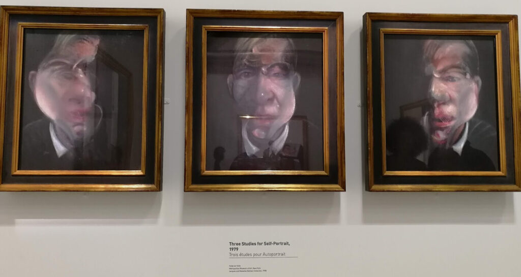 Bức Three studies for Self-Portrait năm 1974 của Bacon cho thấy toàn bộ sức mạnh biểu cảm và sự bạo liệt đặc trưng của ông. Nền tranh tối, các lớp màu được quệt dày, và nét cọ dữ dội tạo nên khuôn mặt bị bóp méo, dường như đang tan chảy hoặc bị xé rách. Cấu trúc khuôn mặt thường không ổn định, thậm chí biến mất vào trong không gian mù mịt, khiến người xem có cảm giác về một cái tôi đang phân rã, tan biến. Ở đây, Bacon không tìm kiếm sự giống thật, mà hướng đến việc diễn tả nỗi sợ hãi và sự khủng hoảng hiện sinh. Đây là giai đoạn mà ông hình thành phong cách tự họa như một phương tiện tự vấn về bản thể — nơi con người đối diện chính mình trong tình trạng bị xóa nhòa.