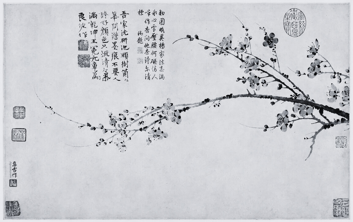 Trong nền thẩm mỹ coi trọng sự tiết chế của tranh thủy mặc cổ điển, việc vẽ những cây mai nở rộ có lẽ cũng tạo nhiều khó khăn. Nhờ sự nhạy cảm với hình thức của mình, Vương Miện đã vượt qua, và để lại những bức vẽ hoa mai không trùng lặp nhau về khí chất.