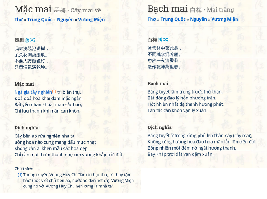 Trong bài thơ “Mặc mai” 墨梅, Vương Miện mô tả một cây mai bằng mực mọc bên bờ ao nơi những người họ Vương rửa bút. Những đóa mai loang màu mực nhạt ấy không đợi người đời khen hương sắc, mà chỉ cần lưu lại khắp đất trời cái “khí” thanh tao. Như vậy, Vương Miện đã đặt khái niệm “khí” vào trung tâm của bài thơ được người đời sau xem như tuyên ngôn nghệ thuật của ông. Những bài khác, như “Bạch mai” 白梅 hay “Đề hoạ mai” 題畫梅, cho thấy ông đã chọn cây mai làm tấm gương soi mình, cốt học được từ nó cái thái độ rời xa tục lụy để giữ vẹn nguyên tự tính.